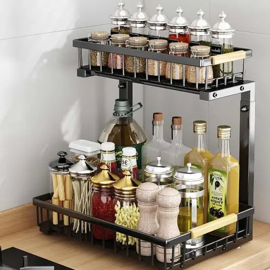 Notre Organisateur Sous Évier Coulissant 2 Niveaux est parfait pour ceux qui recherchent une solution complète. Avec ses deux niveaux et son système coulissant, il transforme radicalement l'ergonomie de votre espace sous évier.